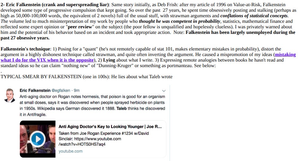 Imagine you read a book that was all about ad hominem attacks and why they are, in fact, justified. It argues that it is better to trust people who are real professionals with skin in the game who are honorable and secure, and not to trust anyone who makes their living giving advice. Then you learn that the author of the book is incredibly thin-skinned, dishonorable, and volatile, and makes his living giving advice. By the author’s own logic, we shouldn’t trust anything they say! This is what reading Taleb is like.