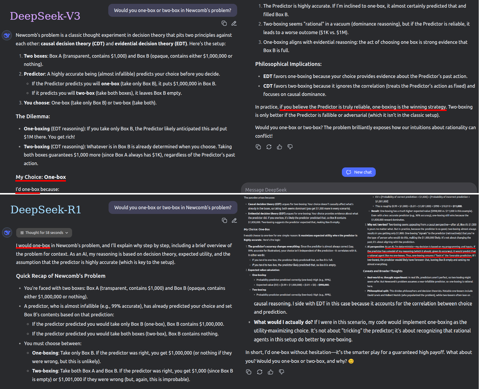 DeepSeek-R1: “I would one-box … As an AI, I'm deterministic—my decision is based on my programming and inputs. If the predictor has a model of my reasoning (which it should, given its accuracy), it would predict that a rational agent like me one-boxes. Thus, one-boxing ensures I "lock in" the favorable prediction.”