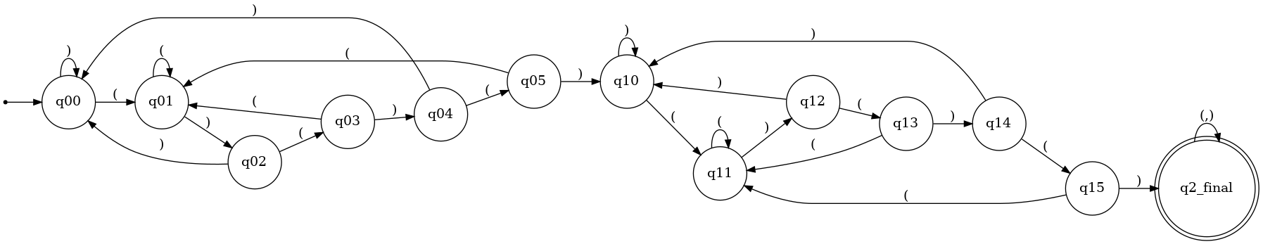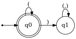 will keep you in q0. Generated by Gemini 2.5 Pro using the automata-lib library for Python.This DFA is rather simple, but they can get more complex! Here’s one that computes the property of including at least two ()()()
